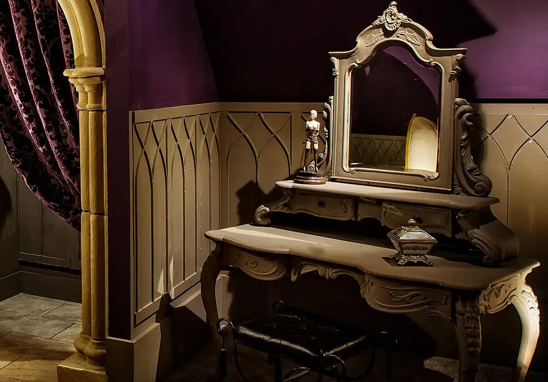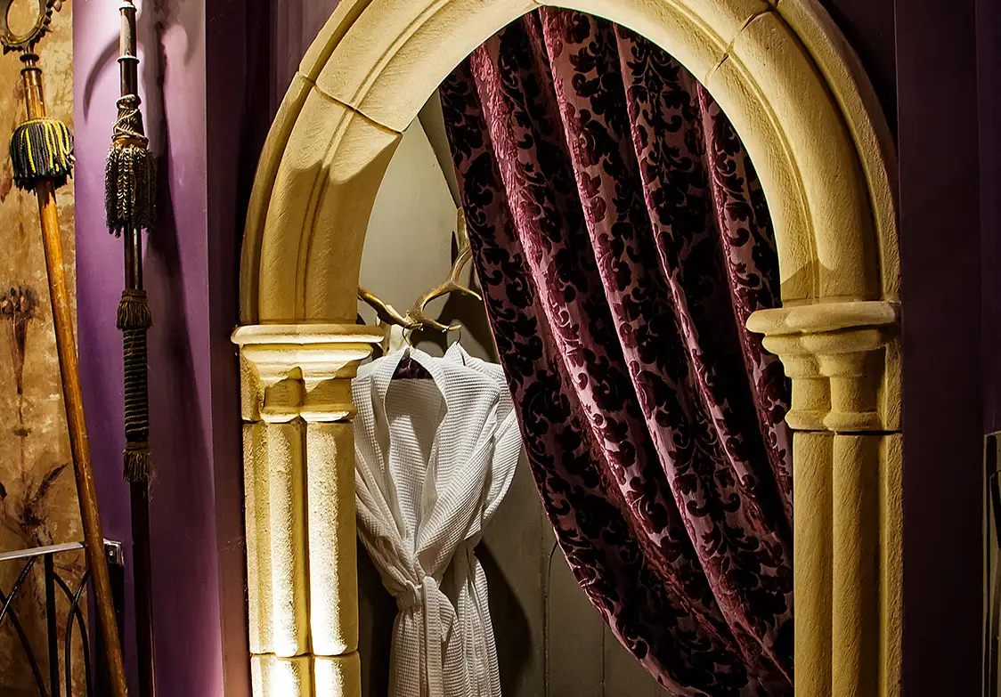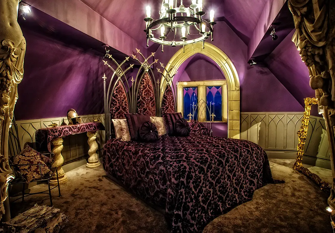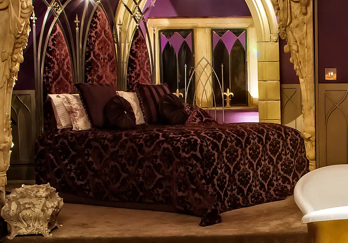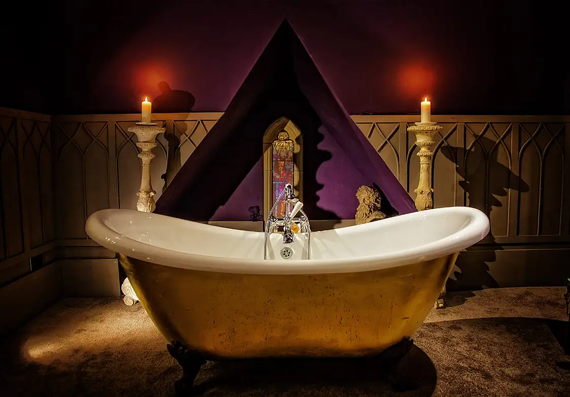The Kings Chamber is the most flamboyantly gothic of all the rooms at Manor Court with its riot of plush plum, gold and pewter, decadently draped bed and featuring the most luxurious gold leaf bath and en-suite.